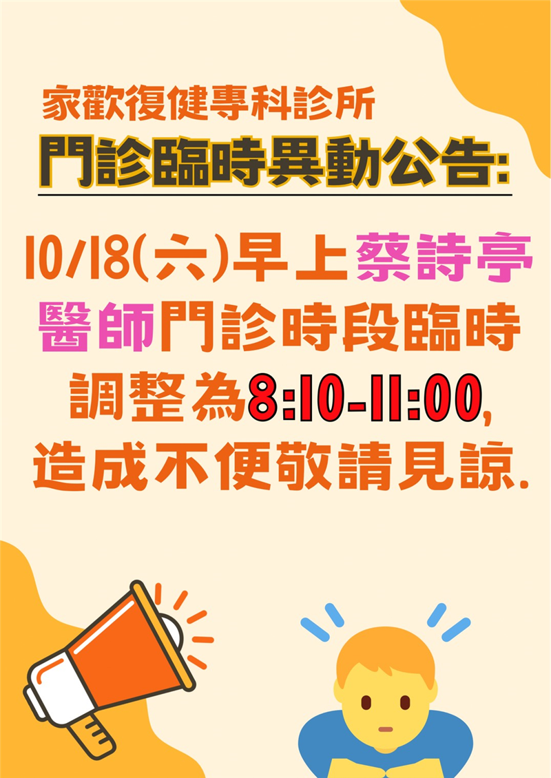 114/10/18(六)早上蔡詩亭醫師門診時段臨時更改為08:10-11:00,造成不便,敬請見諒!